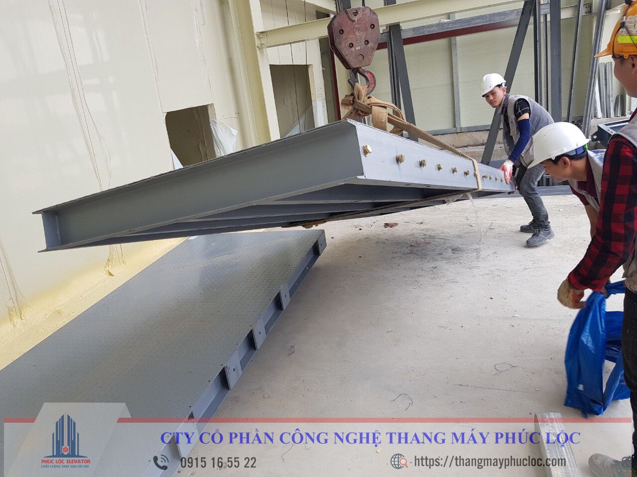 Bước 7: Vệ sinh toàn bộ phần hố thang tiến hành lắp vách và nóc cabin, bộ truyền cửa cabin, và cửa cabin. Đưa thang lên để kiểm tra các thông số kỹ thuật theo đúng yêu cầu đồng thời chất thêm tải đối trọng để cân bằng với tải trọng cabin.