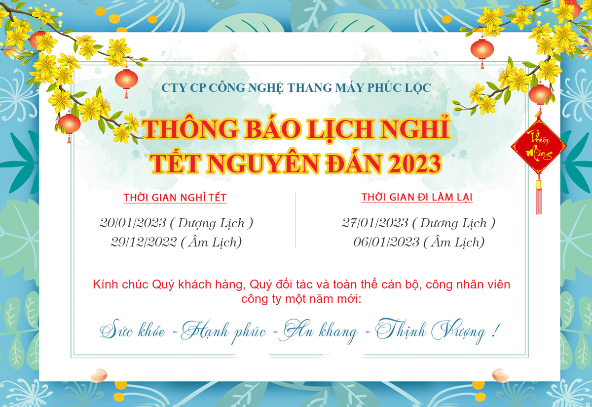 Công ty cổ phần công nghệ thang máy Phúc Lộc, thông báo đến toàn thể Quý Khách hàng, Quý đối tác và toàn thể cán bộ nhân viên công ty về lịch nghỉ tết nguyên đán như sau: